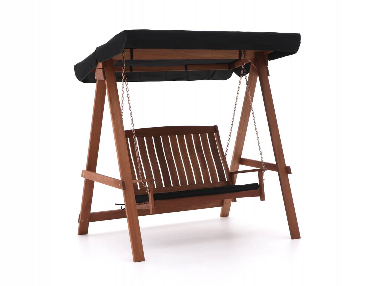 De California schommelbank is uitgevoerd in hardhout met zwart stoffen dak.