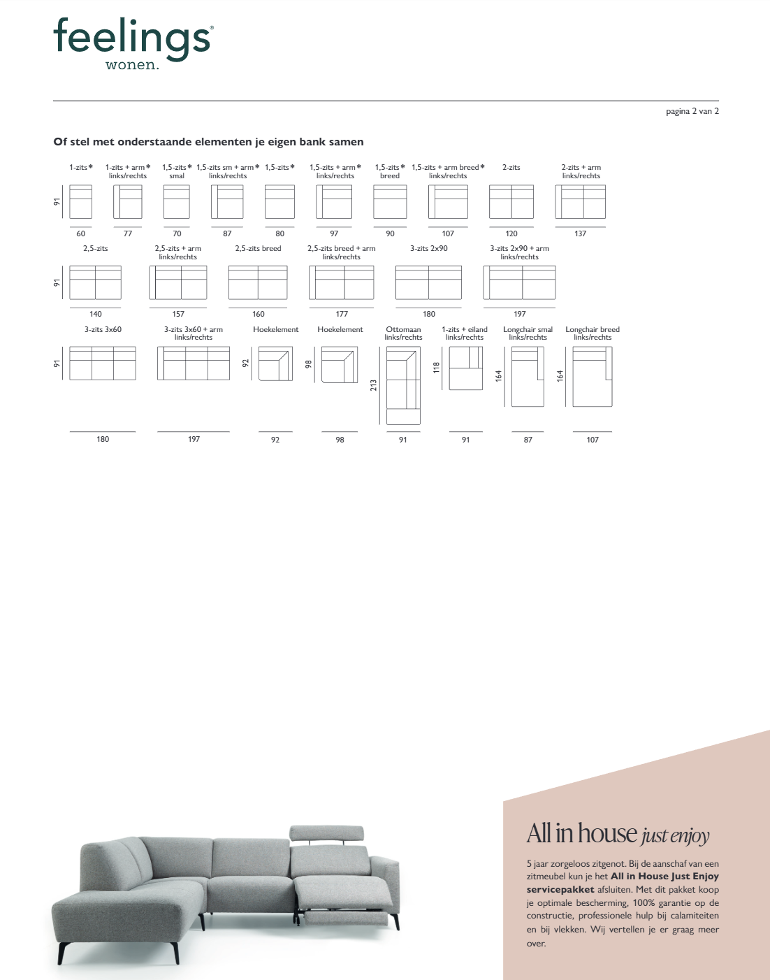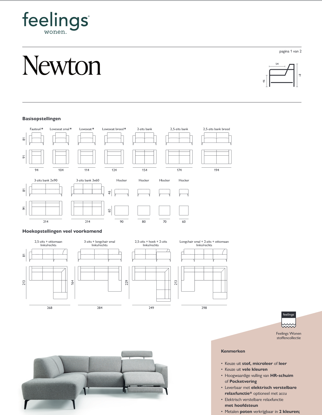 De Newton bank is in standaard uitvoering leverbaar als 3 zit, 2,5 zit, 2 zit en als fauteuil in diverse afmetingen (dit afhankelijk van de armleuning die u toepast. Alle afmetingen zijn leverbaar met of zonder relaxfunctie, de relaxfunctie heeft altijd een hoofdsteun. De Newton hoekbank is als loungebank en hoekbank leverbaar in diverse afmetingen en opstellingen.