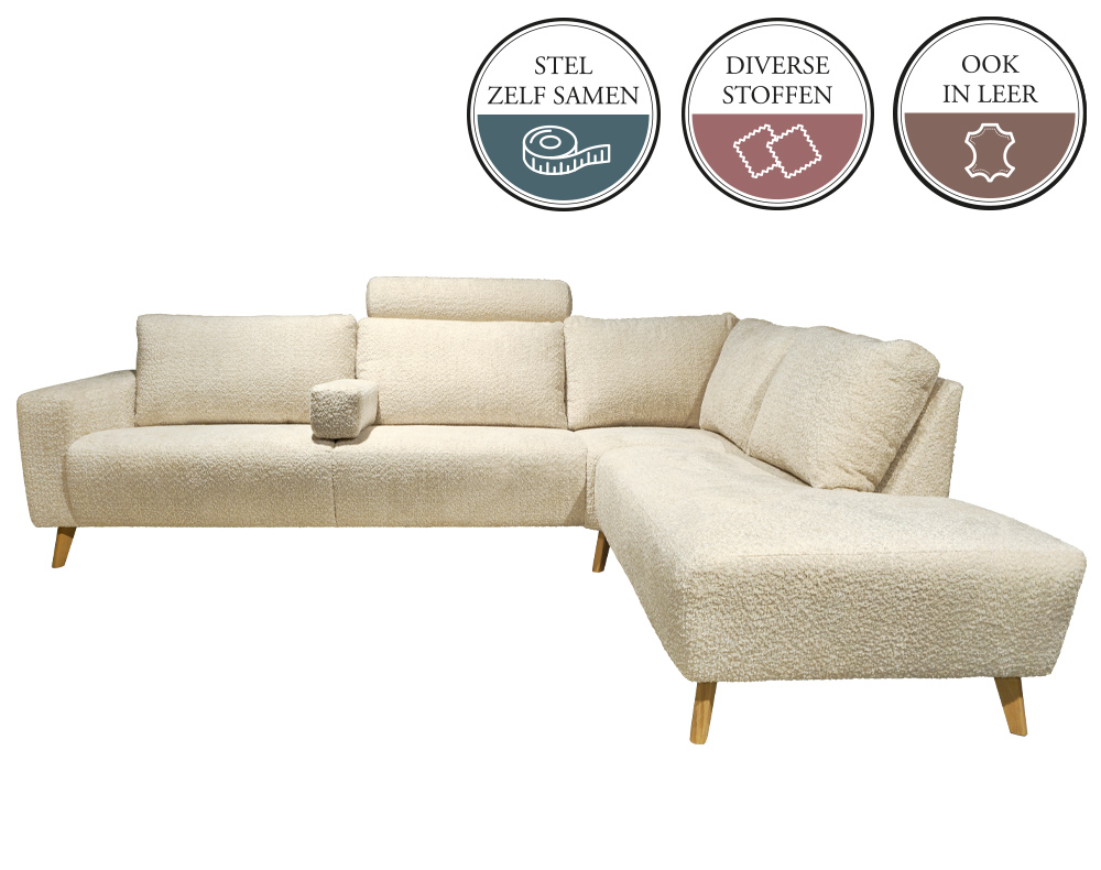 Keuze uit heel veel kleuren en soorten stof, microleer en echt leer. Standaard geleverd met een koudschuim vulling, maar kan tegen meerprijs met pocketvering. De poten zijn mogelijk in hout of metaal in diverse uitvoeringen.