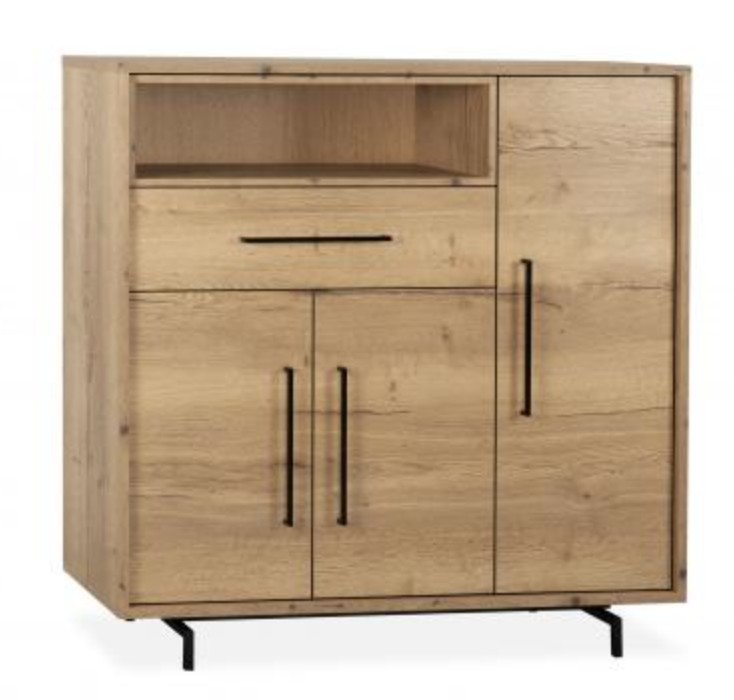 De Valerio wandkast heeft 3 deuren + 1 lade + 1 open vak is 130cm breed x 130cm hoog en 45cm diep. Uitgevoerd in Lamulux natur kleur met zwart metalen poten.